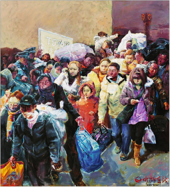 《春潮——回家過年》這幅作品是典型、真實的社會現(xiàn)實和人性本真的寫照,這個瞬間定格了一段讓多少人刻骨銘心的記憶,敘述了周期性的人類大遷徙——春運。該畫所蘊涵的是中國人心中那份最飽滿的希望。旅客是彼此都不認識的陌生人,為了一個回家的目的,毫無距離地擠在一起,人物個性鮮明。畫家具有強大的創(chuàng)作能力和藝術表現(xiàn)力。(邢晨聲 文)