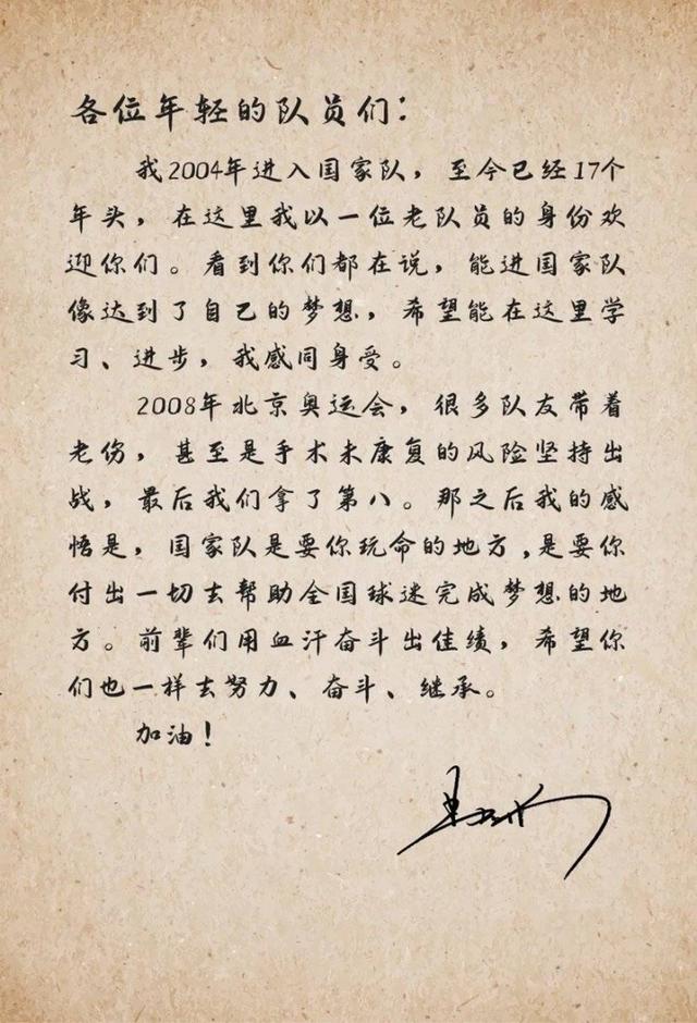 易建聯(lián)在信中回顧了自己首次入選國家隊(duì)的感受,表示自己完全能理解新隊(duì)員此刻的心情,他尤其強(qiáng)調(diào)了榮譽(yù)感與責(zé)任感,對這些小兄弟們說“國家隊(duì)是要你玩命的地方”,“各位年輕隊(duì)員們,我2004年進(jìn)入國家隊(duì),至今已經(jīng)有17個(gè)年頭,在這里我以一位老隊(duì)員的身份歡迎你們。看到你們都在說,能進(jìn)國家隊(duì)像達(dá)到了自己的夢想,希望能在這里學(xué)習(xí)、進(jìn)步,我感同身受。2008年北京奧運(yùn)會,很多隊(duì)友帶著老傷,甚至是手術(shù)未康復(fù)的風(fēng)險(xiǎn)堅(jiān)持出戰(zhàn),最后我們拿到了第八。那之后我的感悟是,國家隊(duì)是要你玩命的地方,是要你付出一切去幫助全國球迷完成夢想的地方。前輩們用血汗奮斗出佳績,希望你們也一樣去努力、奮斗、繼承?!?/span>