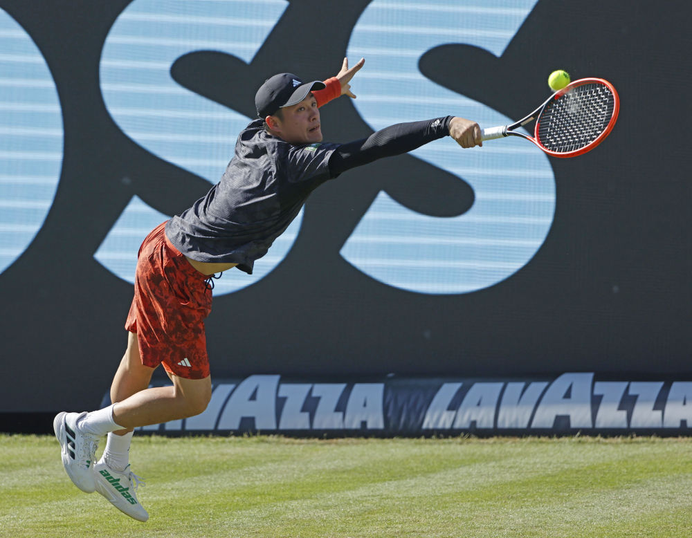 6月13日,吳易昺在比賽中。新華社發(fā)(菲利普·魯伊茲攝) 這場(chǎng)比賽是澳大利亞選手克耶高斯傷愈復(fù)出后的首秀,他在發(fā)球上給吳易昺施加了很大壓力,但在跑動(dòng)方面仍有忌憚。吳易昺不急不躁,底線球表現(xiàn)出色,贏下關(guān)鍵分。 吳易昺賽后說:“我上次打草地比賽還是2017年的青少年比賽。很高興今天首輪遇到尼克(克耶高斯),他是草地上最優(yōu)秀的球員之一,而且發(fā)球非常棒。他今天打出好幾個(gè)ACE球(發(fā)球直接得分且對(duì)手沒有觸及球)。我的制勝關(guān)鍵是保持冷靜和耐心,然后找方法破解?!?/p>