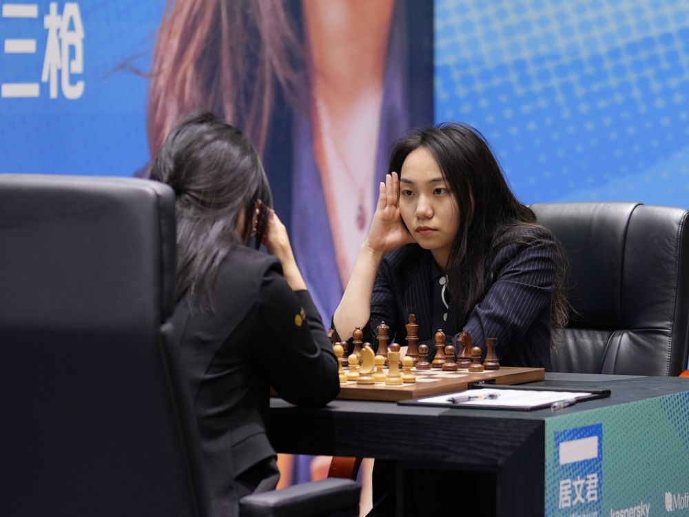 當日的比賽居文君執(zhí)白先行采用后翼棄兵開局,雷挺婕以雙馬防御。隨后挑戰(zhàn)者選擇主動出擊,雙方進行了激烈爭奪,居文君一度在后翼與中心承受不小壓力,但她防守精確,滴水不漏,也耗去雷挺婕不少時間。二人隨后進行了一系列子力交換,轉入大致均勢的車象兵殘局,最終至第40回合雙方形成三次重復局面和棋。