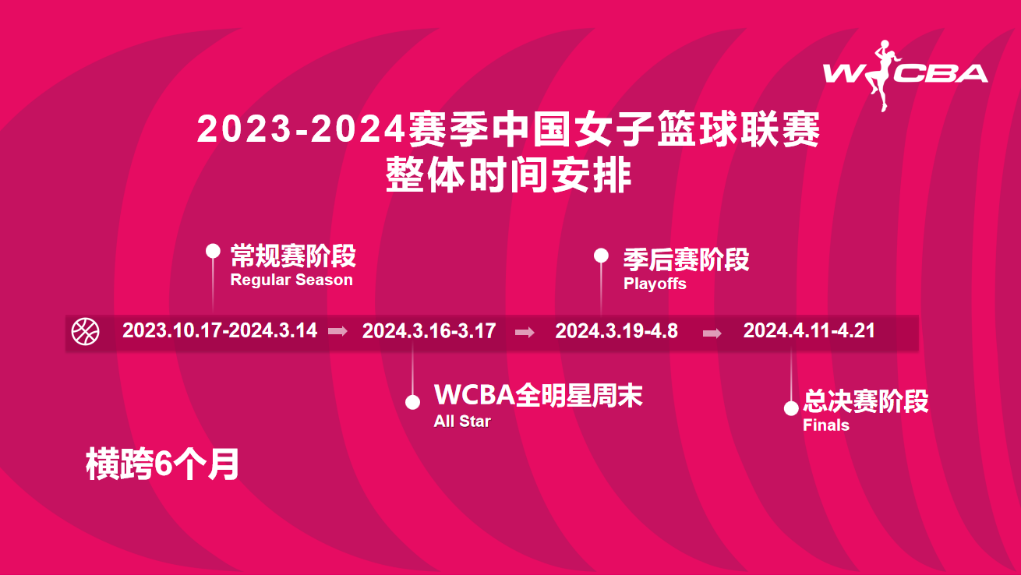 據了解,2023-2024賽季WCBA聯賽的整體時間跨度為6個月,考慮到新年、春節(jié),以及為國家隊備戰(zhàn)和參加巴黎奧運會資格賽留出時間,聯賽常規(guī)賽會分為兩個階段,第一階段從2023年10月17日至2024年1月1日,第二階段從2024年2月17日至3月14日。全明星周末活動將在2024年3月16至17日舉辦。季后賽和總決賽階段從3月19日至4月21日。