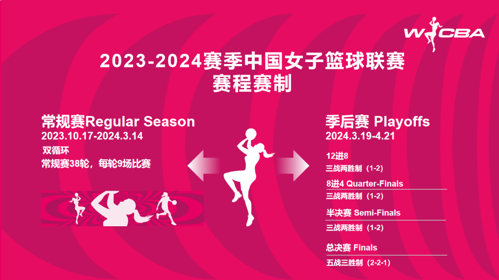 新賽季WCBA聯賽采取主客場雙循環(huán)賽制,常規(guī)賽38輪,每輪9場比賽。季后賽三戰(zhàn)兩勝制,總決賽五戰(zhàn)三勝制。