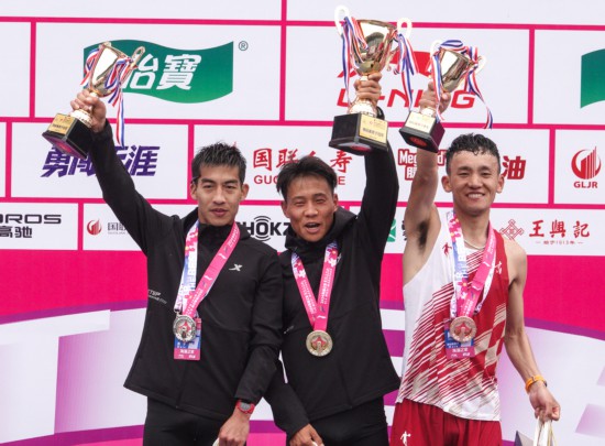 3月24日,冠軍何杰(中)、亞軍楊紹輝(左)和季軍桑吉東知在全國(guó)馬拉松錦標(biāo)賽(第一站)男子組頒獎(jiǎng)儀式上。新華社記者 楊磊 攝