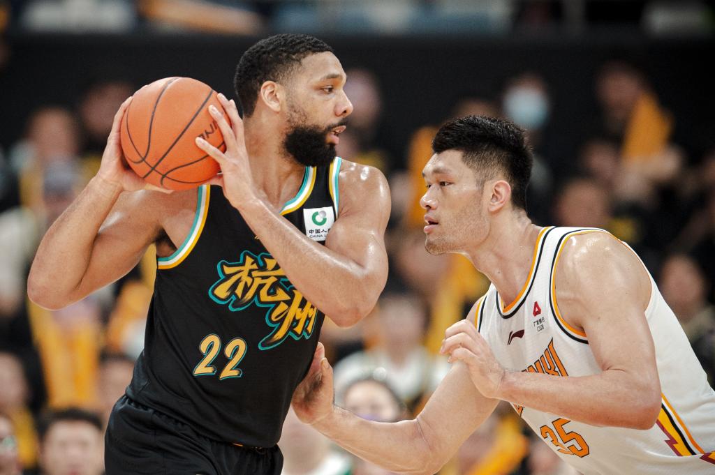 4月10日,廣廈隊(duì)球員韋瑟斯龐(右)防守山西隊(duì)球員施韋德。新華社記者 江漢 攝