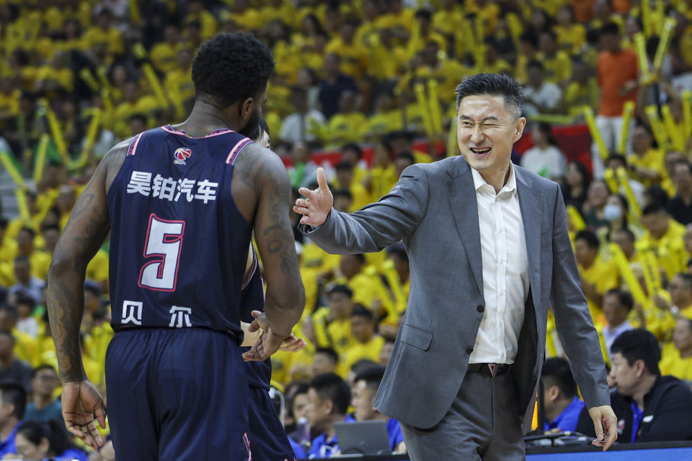 5月6日,廣東隊主教練杜鋒(右)鼓勵球員貝爾。新華社發(fā)(鄭家雄攝)