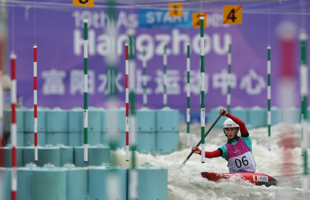 2023年10月7日,杭州亞運會皮劃艇激流回旋項目女子單人劃艇決賽在杭州富陽水上運動中心舉行,圖為中國選手黃娟在比賽中獲得冠軍。新華社記者 杜瀟逸 攝