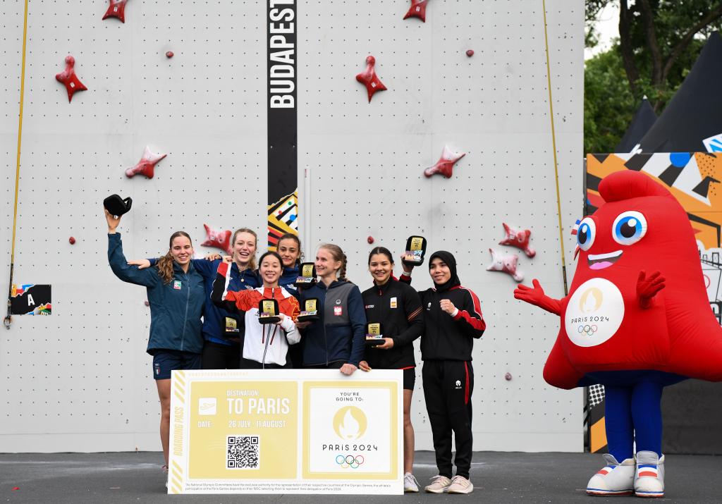 6月22日,中國選手周婭菲(左三)與其他獲得女子攀巖速度賽巴黎奧運會參賽資格的選手合影。新華社記者 連漪 攝