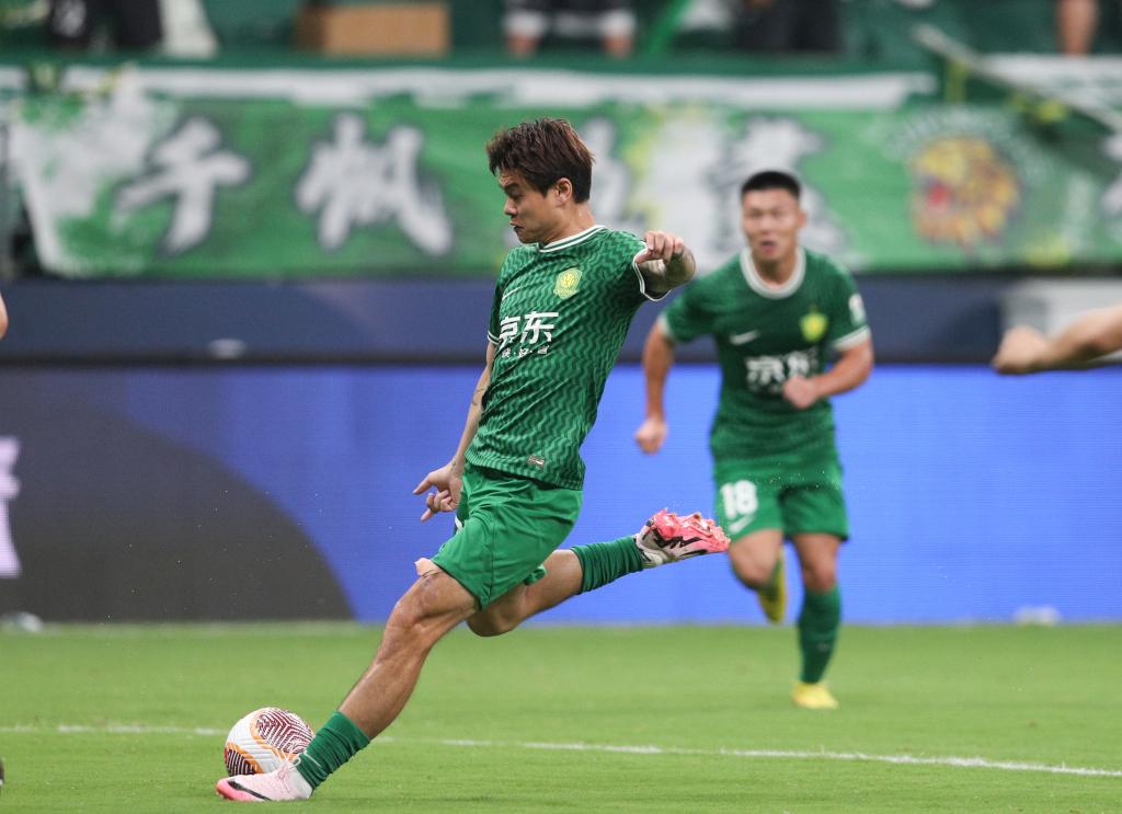 6月26日,北京國安隊球員楊立瑜射門得分。新華社記者 許雅楠 攝