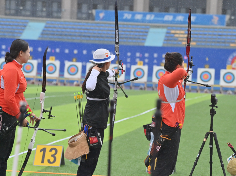 本次比賽共設(shè)置男子反曲弓個(gè)人、女子反曲弓個(gè)人、男子反曲弓團(tuán)體、女子反曲弓團(tuán)體、反曲弓混合團(tuán)體5個(gè)競(jìng)賽項(xiàng)目。當(dāng)日比賽中,江蘇隊(duì)、天津1隊(duì)、吉林1隊(duì)暫列女子反曲弓團(tuán)體前三名,山東隊(duì)、上海1隊(duì)、廣東隊(duì)暫列男子反曲弓團(tuán)體前三名。