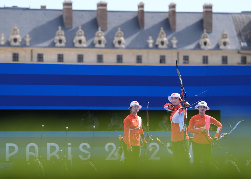 巴黎奧運會射箭女子團(tuán)體比賽28日在榮軍院進(jìn)行。中國隊在四分之一決賽、半決賽中分別戰(zhàn)勝印度尼西亞隊和墨西哥隊,與先后戰(zhàn)勝中國臺北、荷蘭隊的韓國隊會師決賽。