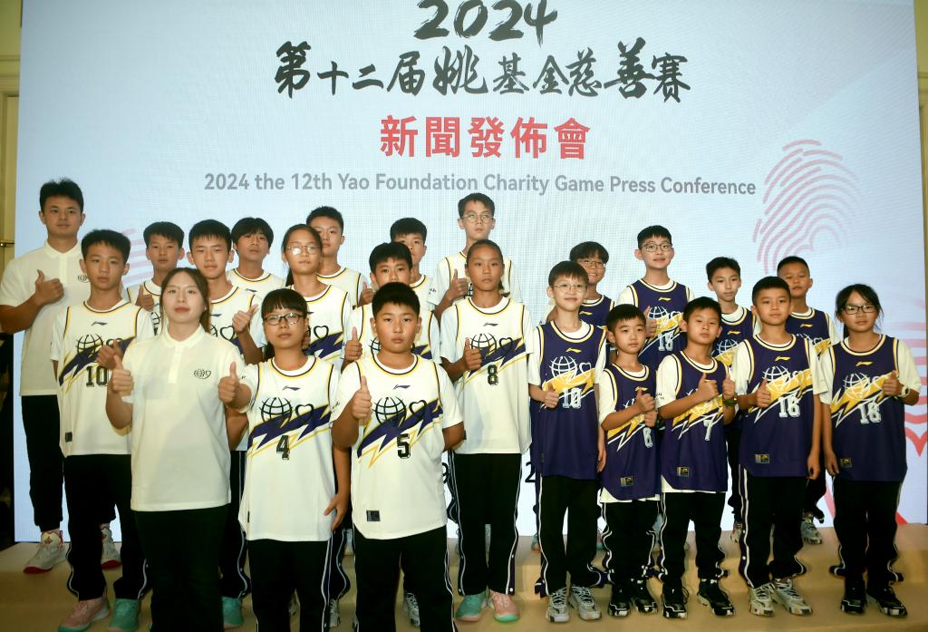 8月19日,姚基金小球員在新聞發(fā)布會(huì)上合影。新華社記者 盧炳輝 攝