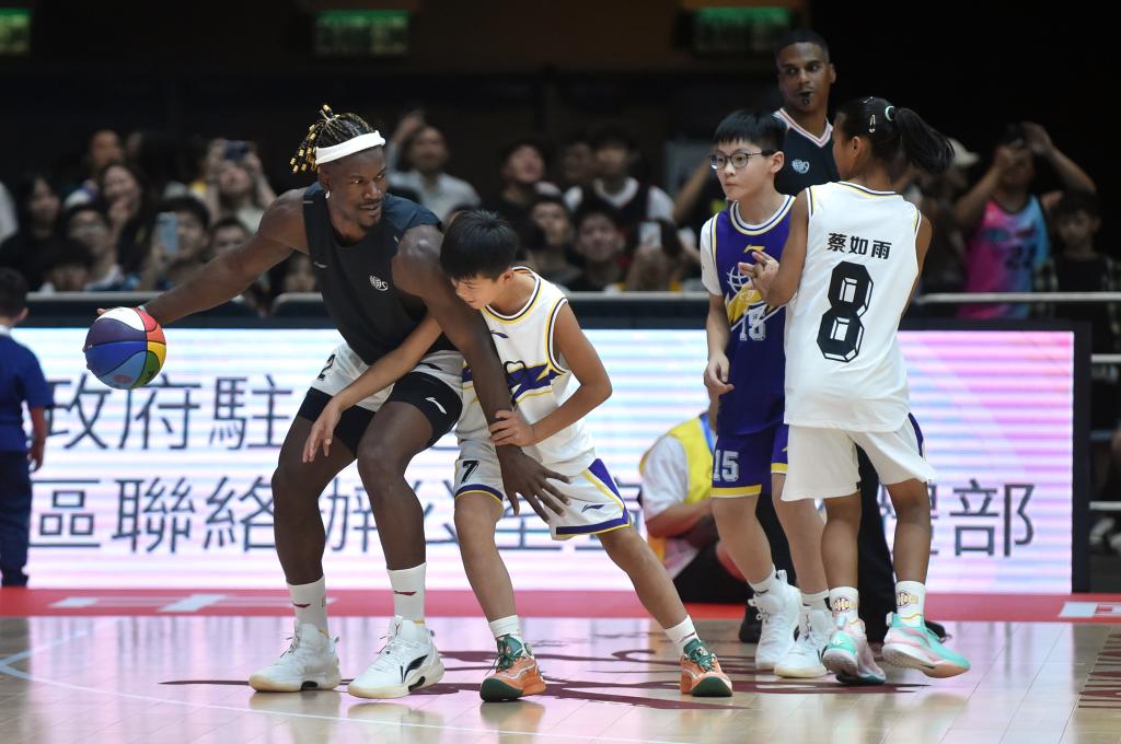 8月20日,國(guó)際籃球明星隊(duì)球員吉米·巴特勒(左一)與小球員互動(dòng)。新華社記者 盧炳輝 攝