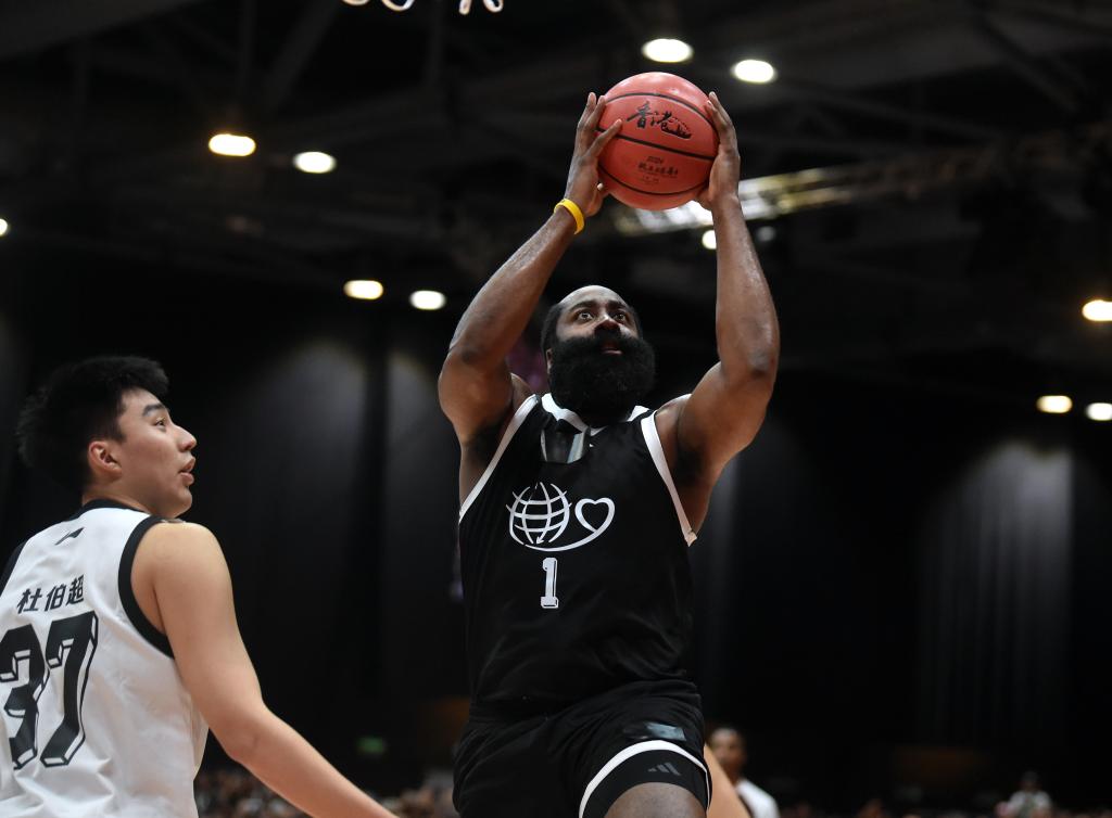 8月20日,國(guó)際籃球明星隊(duì)球員哈登(右)在比賽中上籃。新華社記者 盧炳輝 攝