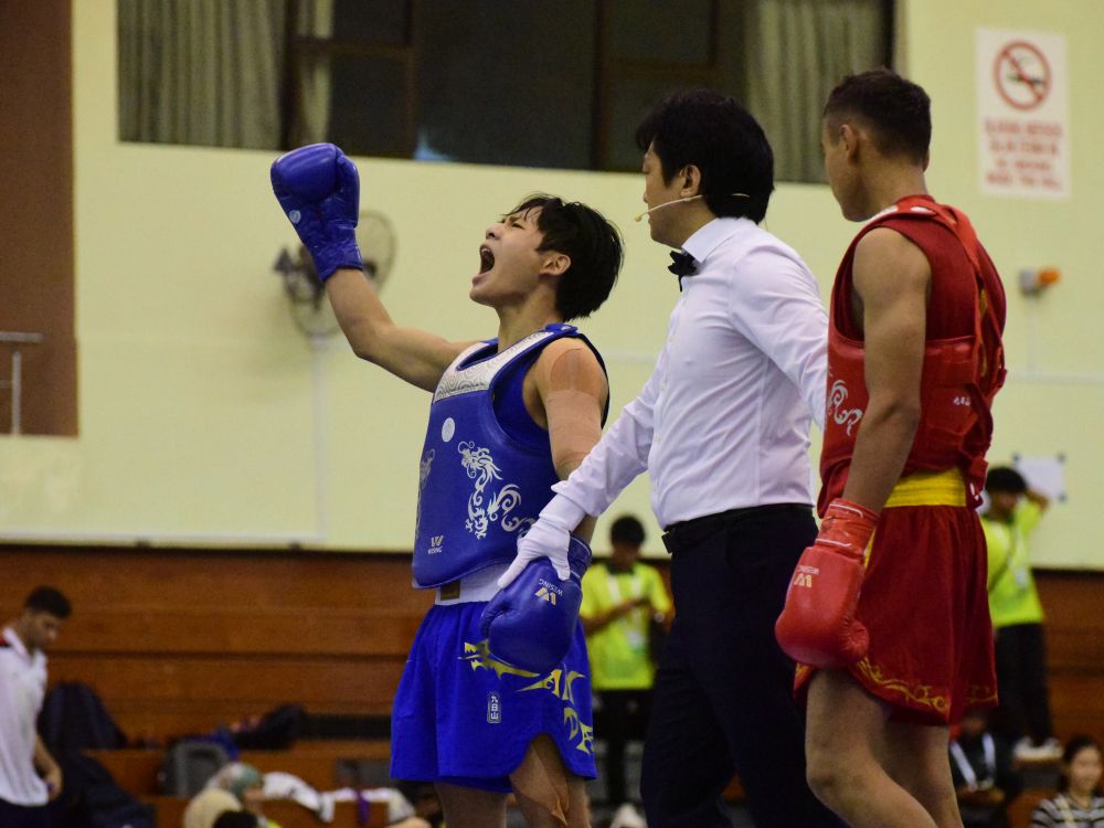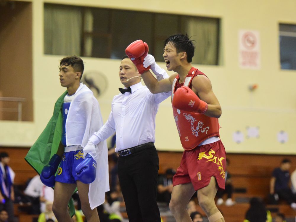 9月29日,在文萊舉行的第九屆世界青少年武術(shù)錦標(biāo)賽散打男子56公斤級決賽中,中國選手馮俊杰戰(zhàn)勝烏茲別克斯坦選手奧季洛夫,獲得冠軍。新華社記者 李萌 攝