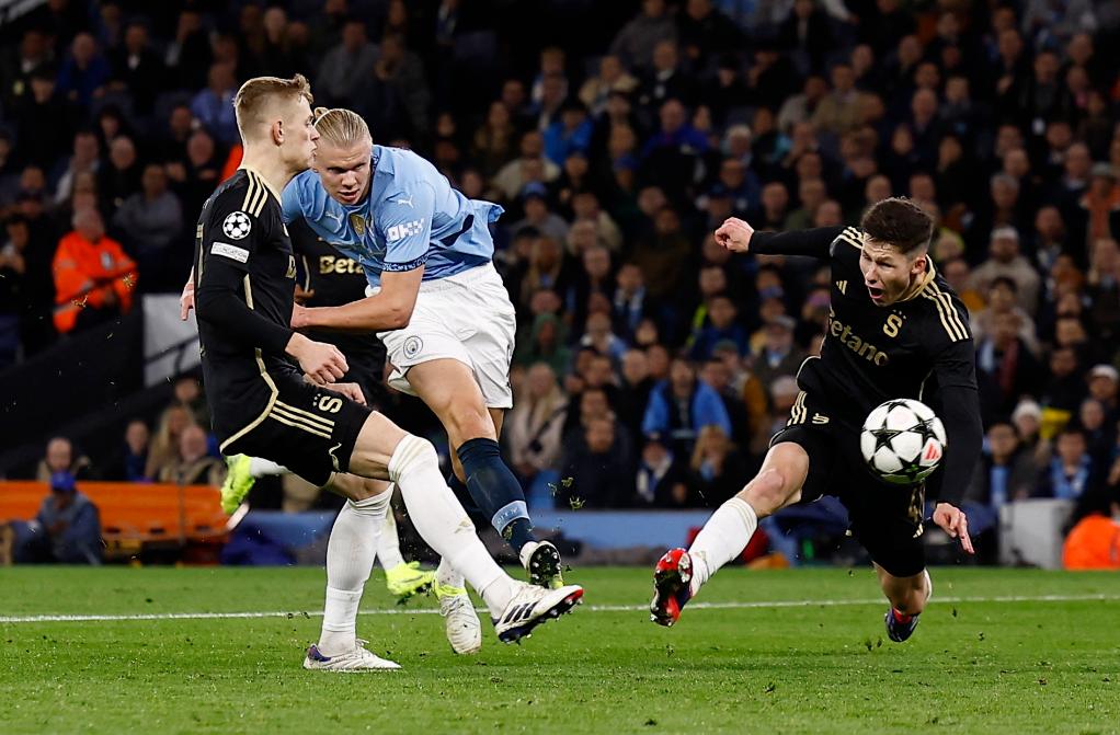 10月23日,曼城隊(duì)球員哈蘭德(中)在比賽中射門得分。新華社發(fā)