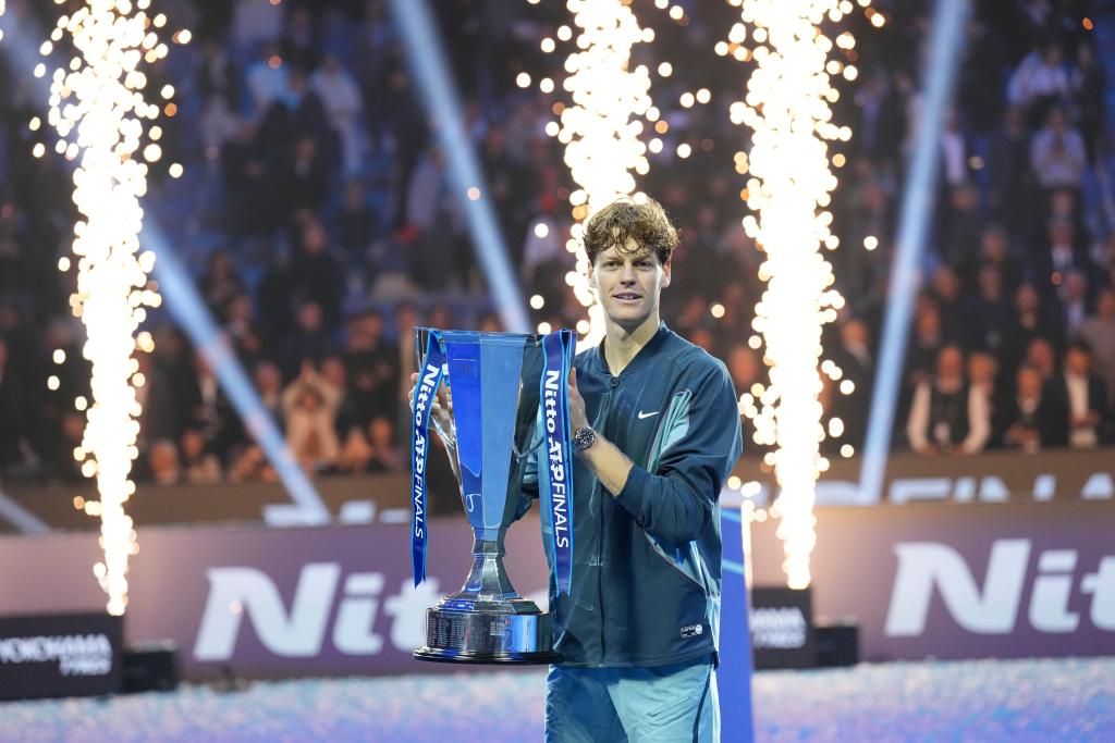 11月17日,辛納在頒獎儀式上與冠軍獎杯合影。新華社記者 李京 攝