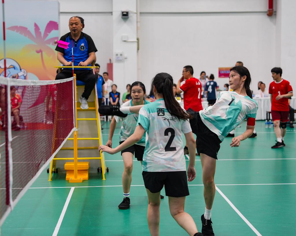 11月24日,西藏隊(duì)球員朱莉玲(右一)在第十二屆全國少數(shù)民族傳統(tǒng)體育運(yùn)動(dòng)會毽球女子三人小組賽中進(jìn)攻。新華社記者 晉美多吉 攝