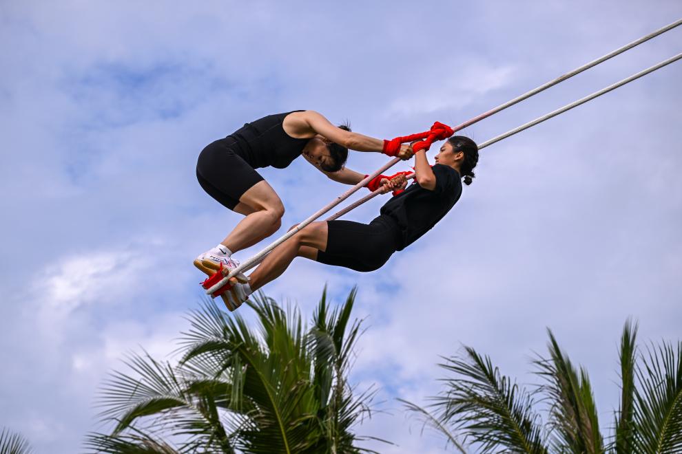 洪吐斯汗·杜開,這位“河貍”選手在上一屆運(yùn)動會獲得過二等獎。這次來到三亞,她和新伙伴有著20歲左右的年齡差距,但依然合作默契。對古麗阿亞提而言,洪吐斯汗既是一位好隊(duì)友,又是一位大姐姐,有時還像一位“教練”。比賽的時候,洪吐斯汗在完成規(guī)律的發(fā)力動作、保持呼吸節(jié)奏的同時,還會安撫搭檔的情緒,提醒搭檔調(diào)整體態(tài),力求得分。