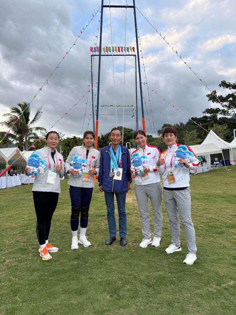 23日,新疆代表團(tuán)獲得本屆運(yùn)動會秋千項(xiàng)目55kg雙人觸鈴比賽的三等獎。頒獎儀式后,師徒三人回到休息區(qū),收拾東西準(zhǔn)備離開。那一刻,天空由陰轉(zhuǎn)晴,陽光溫暖耀眼,掛在兩位新疆“古麗”身上的獎牌,閃閃發(fā)光。