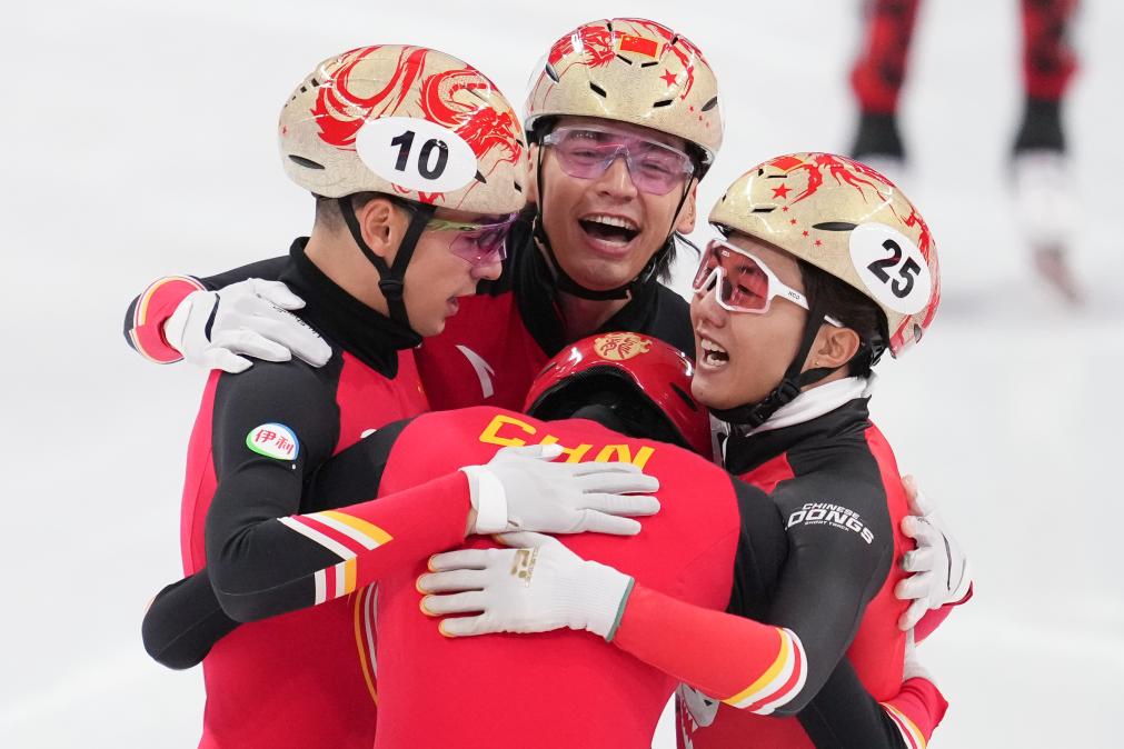 12月8日,中國隊選手劉少昂(左)、劉少林(后)、李文龍(右)和孫龍在比賽結(jié)束后慶祝。新華社記者 鞠煥宗 攝