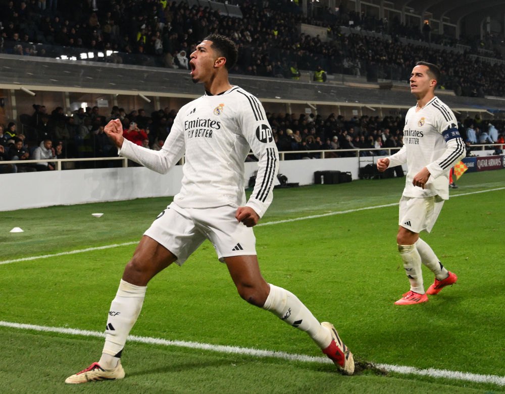 12月10日,皇家馬德里隊(duì)球員貝林厄姆(左)在比賽中慶祝進(jìn)球。新華社發(fā)(阿爾貝托·林格利亞攝)