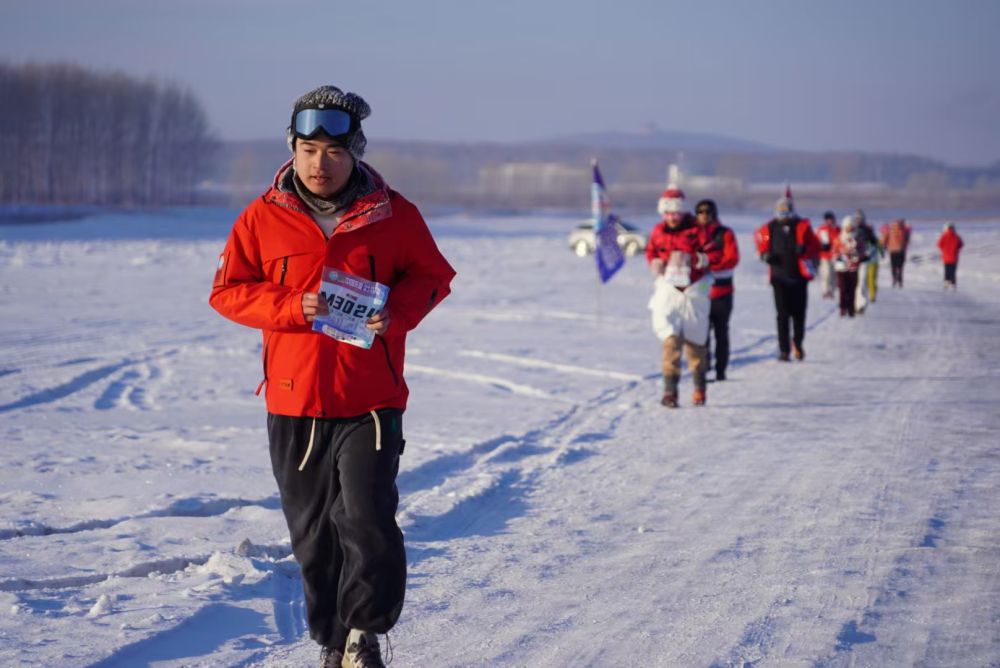 身穿速干衣、抓絨外套,頭戴帽子口罩,腳踩用于防滑的冰爪,不少跑友“全副武裝”,以抵擋戶外嚴寒。“我每個月至少參加兩場馬拉松比賽,但這是第一次參加冰上的,很有新鮮感。這里和我們那邊的溫差能達到近60攝氏度。沿途風景很遼闊,讓人心情愉悅?!睆V州游客劉俊逸說,本次比賽賽事保障很到位,在冰面跑步也讓人安全感滿滿。