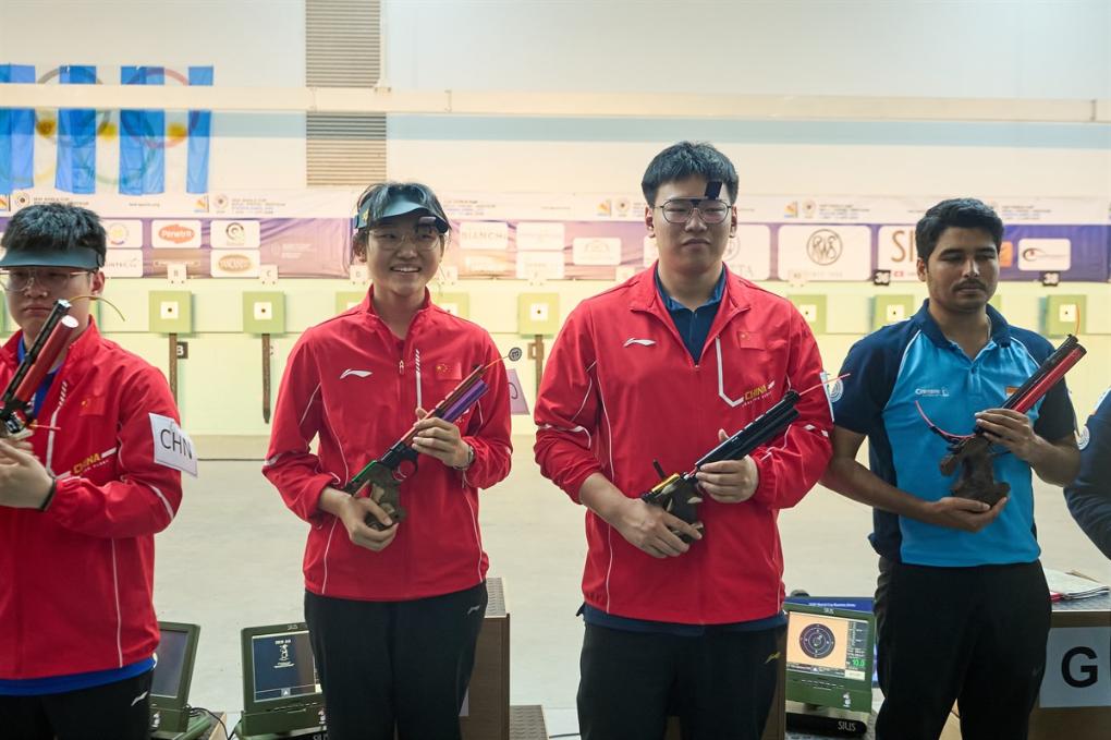 10米氣手槍混合團體冠軍張益梵(右二)/馬千珂(右三)在比賽現場。圖片來自國際射聯(lián)官網