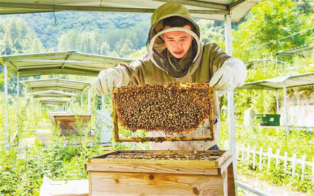 △石柱縣中益鄉(xiāng),蜂農(nóng)查看蜜蜂生長(zhǎng)和產(chǎn)蜜情況。