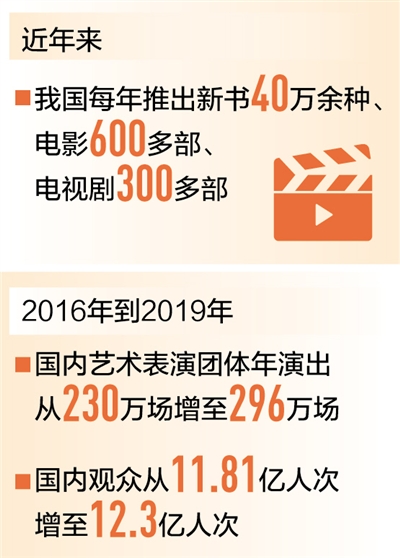 在作品質(zhì)量提升的同時(shí),我國(guó)文化產(chǎn)品的供給能力也在持續(xù)增強(qiáng)。目前我國(guó)每年推出新書40萬(wàn)余種、童書4萬(wàn)多種、電影600多部、電視劇300多部、動(dòng)漫400多部……眾多文化產(chǎn)品的生產(chǎn)規(guī)模位居世界前列。演出市場(chǎng)持續(xù)繁榮,2016年到2019年,國(guó)內(nèi)藝術(shù)表演團(tuán)體年演出場(chǎng)次從230萬(wàn)場(chǎng)增長(zhǎng)至296萬(wàn)場(chǎng),國(guó)內(nèi)觀眾從11.81億人次增加至12.3億人次,其中農(nóng)村觀眾超過7億人次。