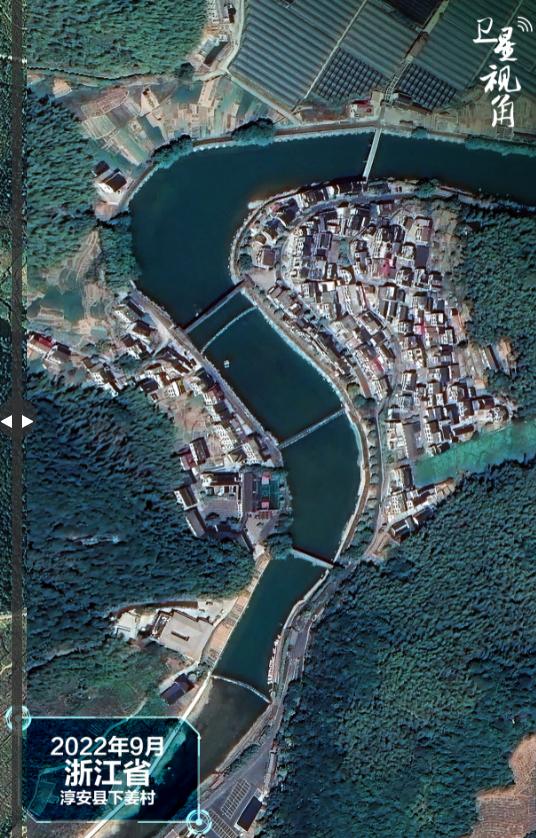 ↑點擊圖左側(cè)白色箭頭標識左右滑動看變化。2022年跟2013年相比,在河流彎曲處不少平房變小樓,下姜村村容村貌改善。