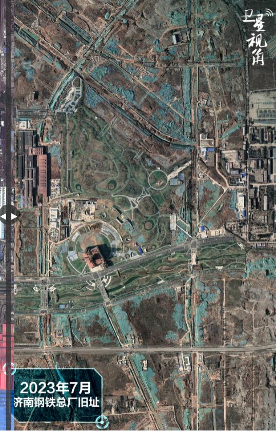 ↑點擊圖左側(cè)白色箭頭標識左右滑動看變化。2023年跟2012年相比,在濟鋼總廠舊址上,翠綠的中央森林公園代替了舊廠房。