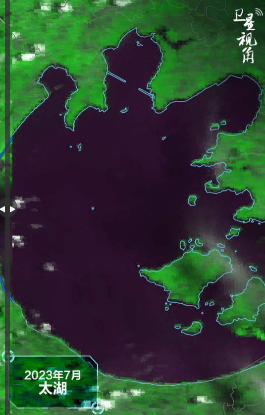 ↑點擊圖左側(cè)白色箭頭標識左右滑動看變化。2023年跟2013年相比,太湖藍藻面積明顯變少。