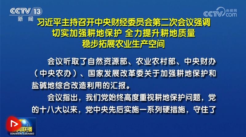 | 習(xí)近平主持召開中央財(cái)經(jīng)委員會第二次會議強(qiáng)調(diào) 切實(shí)加強(qiáng)耕地保護(hù) 全力提升耕地質(zhì)量 穩(wěn)步拓展農(nóng)業(yè)生產(chǎn)空間 |