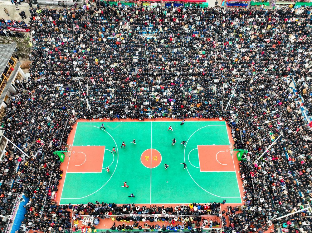 這是2023年3月27日在黔東南州臺江縣臺盤村拍攝的貴州省首屆“美麗鄉(xiāng)村”籃球聯賽總決賽比賽現場(無人機照片)。新華社記者 歐東衢 攝
