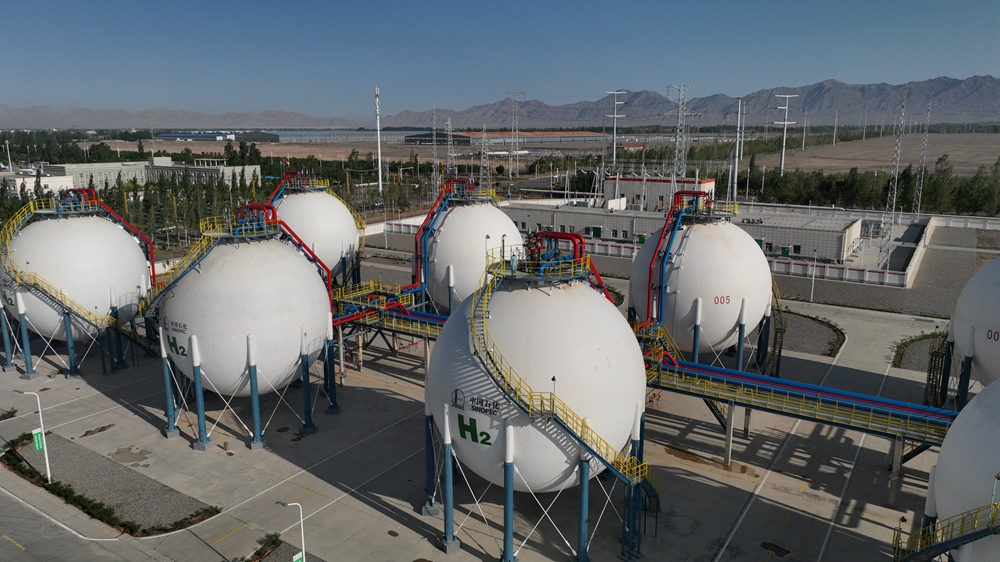 這是2023年6月30日拍攝的中國石化新疆庫車綠氫示范項目制氫廠儲氫罐區(qū)(無人機照片)。新華社記者 顧煜 攝