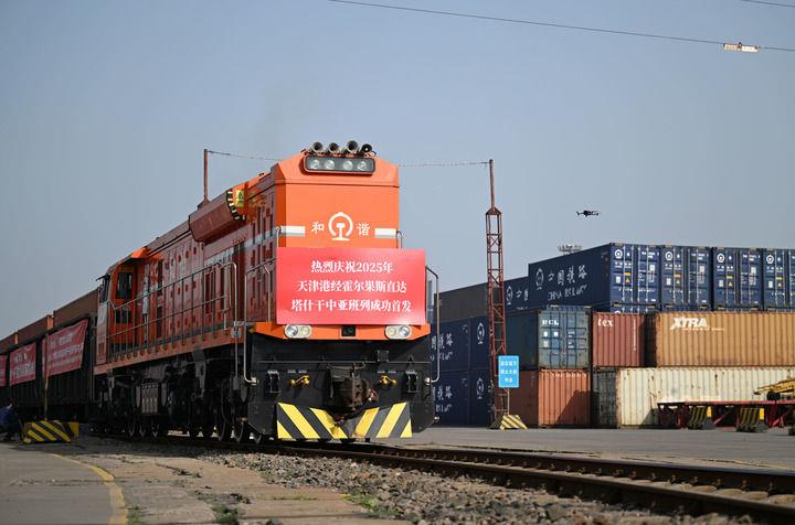 △2025年5月20日,2025年首列天津港經(jīng)霍爾果斯直達(dá)塔什干的中亞班列從天津港物捷三堆場(chǎng)發(fā)車(chē)。