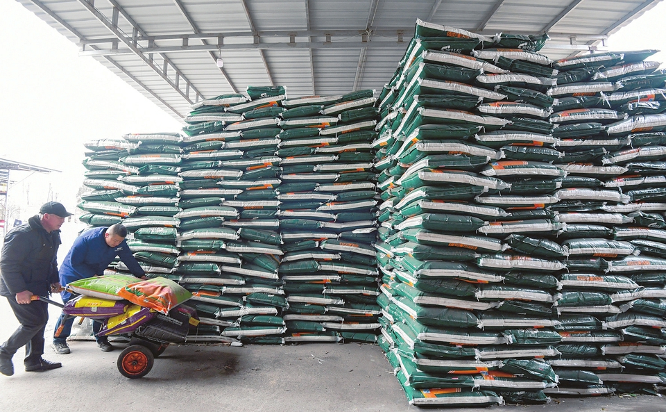 2月24日,長(zhǎng)子縣清風(fēng)農(nóng)資連鎖有限責(zé)任公司院內(nèi),工人在搬運(yùn)化肥。隨著春耕生產(chǎn)臨近,該公司開通綠色通道,24小時(shí)不間斷作業(yè),加快化肥裝卸、轉(zhuǎn)運(yùn),全力保障春耕備耕。梁棟攝