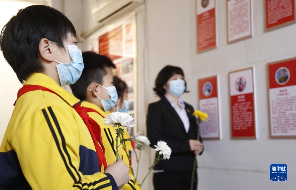 4月4日,在河北省邢臺市襄都區(qū)東郭村鎮(zhèn)北陳村社區(qū)英烈事跡館,學(xué)生敬獻鮮花緬懷先烈。