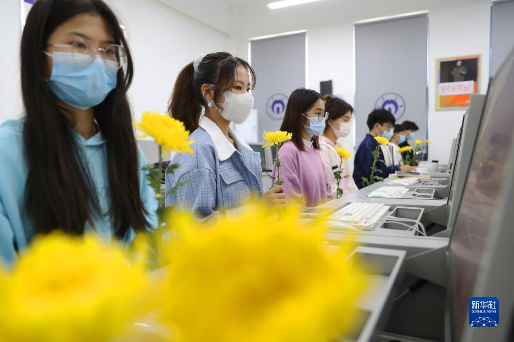 4月4日,在湖南省衡陽市南華大學(xué)經(jīng)濟管理與法學(xué)學(xué)院,同學(xué)們參加網(wǎng)上祭英烈活動。