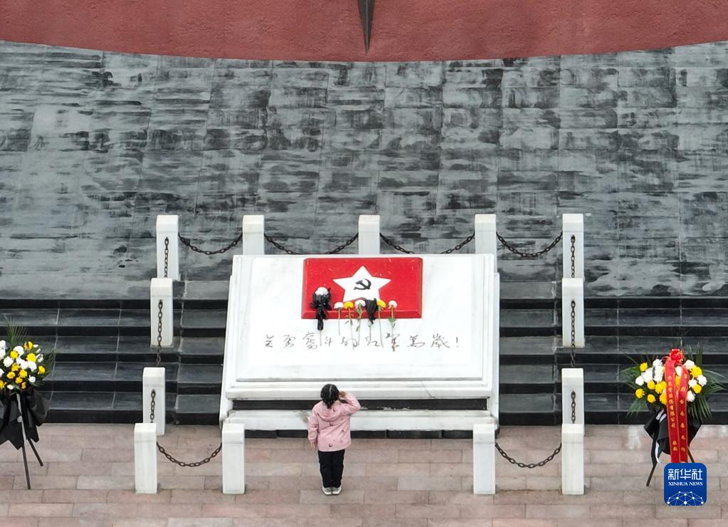 4月4日,在貴州省遵義市紅軍烈士陵園,一名小朋友在紅軍烈士紀念碑前敬少先隊隊禮,緬懷先烈(無人機照片)。