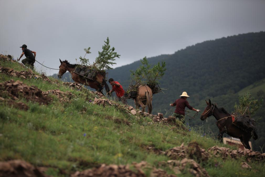 在承德豐寧滿族自治縣千松壩林場,群眾將樹苗運(yùn)往山上。王立群 攝