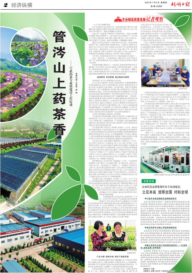如何破局破題,乘勢而上?寧武縣委、縣政府堅(jiān)持把藥茶專業(yè)鎮(zhèn)創(chuàng)建工作作為特優(yōu)興農(nóng)的有效載體,發(fā)揮藥茶原料地道、工藝獨(dú)特、功效顯著的優(yōu)勢,建設(shè)以“一主三輔”(一主即毛建茶、三輔即中藥材、艾草和功能性食品等)主打的藥茶專業(yè)鎮(zhèn),整合打造經(jīng)濟(jì)高質(zhì)量發(fā)展的重要增長極,助力縣域經(jīng)濟(jì)高質(zhì)量發(fā)展。