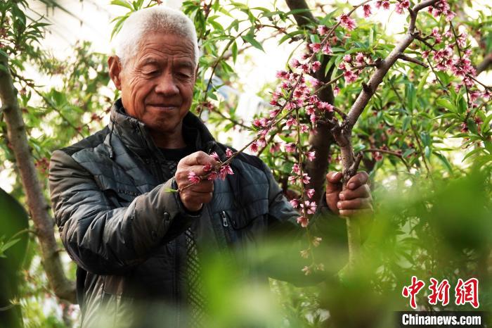 桃農(nóng)查看中油4號(hào)油桃桃花授粉情況。高新生 攝