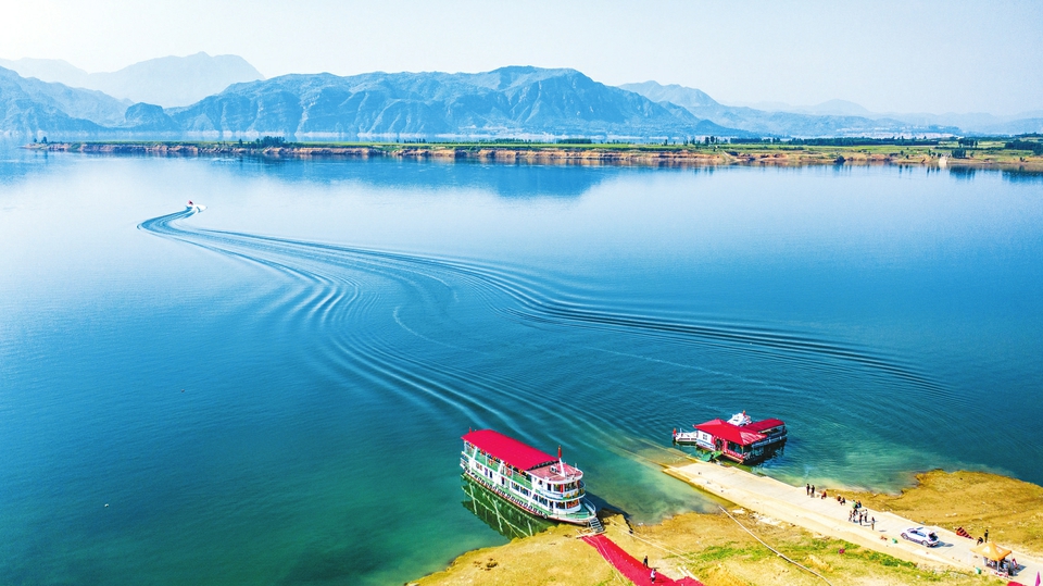 5月5日,在垣曲縣古城國家濕地公園內(nèi),游客或乘游輪、或乘快艇,游覽濕地如詩如畫美景,樂享假日。近年來,隨著當(dāng)?shù)丶哟鬂竦亻_發(fā)與保護(hù)力度,黃河濕地生態(tài)環(huán)境得以明顯改善,生態(tài)文明建設(shè)成果更好地惠及人民。