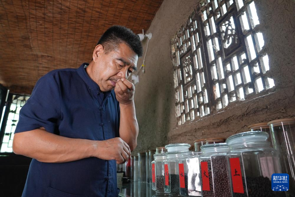 張書芳在查看已經(jīng)制作完成的香珠品質及保存情況(7月9日攝)。(新華社發(fā) 蘇筱雅 攝)