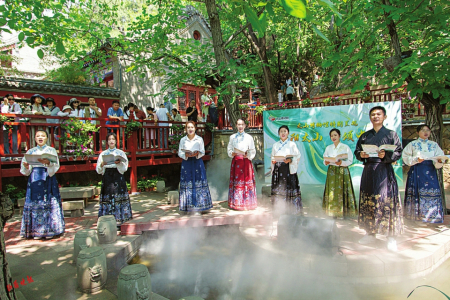 在太山景區(qū)售票廳里,背誦古詩詞免門票的活動吸引了不少18周歲以下的學(xué)生參加,大家通過轉(zhuǎn)盤選定需要背誦的古詩詞,完成背誦即可獲得門票一張。“和同學(xué)們正好一塊兒來了,通過參加這個活動,弘揚我們的傳統(tǒng)文化,是非常有意義的?!苯衲晔钇冢骄皡^(qū)面向廣大學(xué)生推出皮影戲、手工DIY印章、拓印等非遺體驗活動。同時,景區(qū)還準(zhǔn)備了2000多套漢服,免費為游客提供。