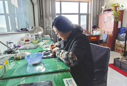 稷山螺鈿漆器髹飾技藝代表性傳承人李?lèi)?ài)珍正在專(zhuān)心創(chuàng)作。