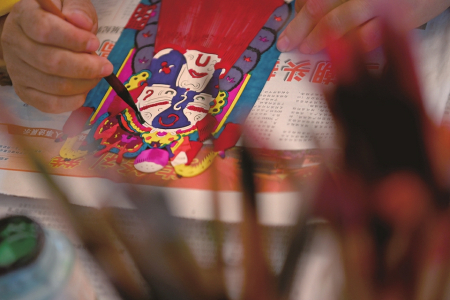 這么有趣的剪紙作品又是如何誕生的呢?走進該博物館剪紙制作車間,只見學員們手中的刻刀上下跳動,一件件精美的剪紙作品雛形便逐漸顯現(xiàn)?!耙患艏堊髌返闹谱鹘^對不是靠簡簡單單的一把剪刀、一張紅紙就可以完成的,它要經(jīng)歷設(shè)計、刀刻、顏染、裝裱4個大步驟38個小步驟。”博物館講解員曹慧中指著剪紙學員對眾人說,“他們正在進行的是刀刻這一道工序,我們不要求每個人每個工序都會都熟練,熟練的剪紙藝人制作一件剪紙作品也得花費一天時間,剪紙的制作需要團結(jié)協(xié)作而不是單打獨斗?!?/p>