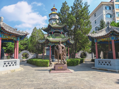 穿過(guò)大門(mén),一座約3米高的古銅色左權(quán)將軍塑像巍然屹立。將軍身披軍大衣,目光堅(jiān)定地望向遠(yuǎn)方,仿佛仍在守護(hù)這片曾經(jīng)戰(zhàn)斗過(guò)的土地。塑像后方,蒼松翠柏掩映著亭臺(tái)廊廡,肅穆之感油然而生。