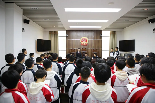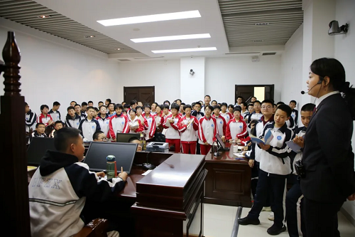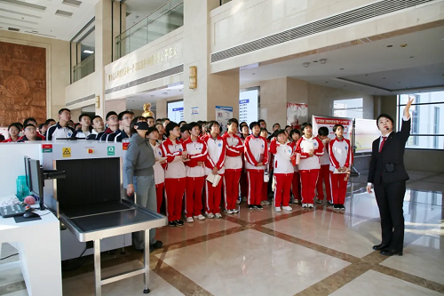 “同學(xué)們,這邊是我們的安檢通道,進(jìn)入法院的人員需要在這里接受安全檢查,所有違禁物品是不能進(jìn)入法院的?!痹诜ㄔ褐v解員的帶領(lǐng)下,同學(xué)們先后參觀了訴訟服務(wù)中心、陽光大廳、審判法庭、法治宣傳教育室、院史陳列室等場所,認(rèn)真觀看了中院全面建設(shè)專題片和中院干警自編自導(dǎo)自演的預(yù)防未成年人犯罪題材法治微電影《你依然是天使》,全面了解了法院的職能作用、機(jī)構(gòu)設(shè)置、辦案流程和歷史文化等情況。